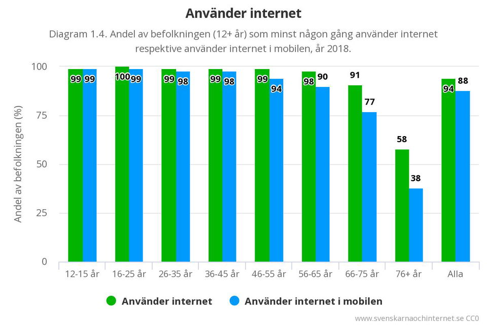 Så gott som alla mellan 12 och 45 år använder internet i mobilen (98–99 %). 94 procent av 46–55-åringarna använder internet i mobilen. Motsvarande siffror för 56–65-åringarna är 90 procent och bland 66–75-åringarna 77 procent. I åldersgruppen 76 år och äldre använder en minoritet, 38 procent, internet i mobilen.